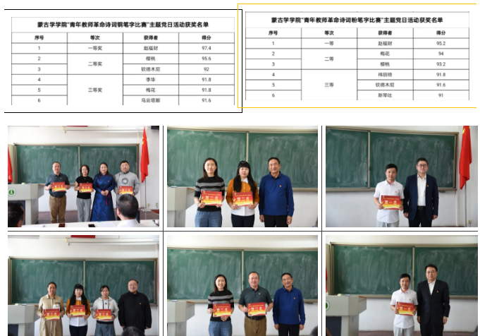 最终,经评委组认真比较及评论,赵福财老师一举摘得粉笔字组和钢笔字组桂冠;钢笔字组樱桃、钦德木尼,粉笔字组樱桃、梅花获得二等奖;钢笔字组李华、梅花、乌云塔娜,粉笔字组钦德木尼、祎丽琦、斯琴吐获得三等奖。